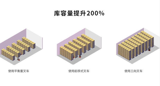 窄巷道車型通過與通道寬度的縮減以及起升高度的增加,有效的提高了倉庫的庫容量,相對比平衡重車型,同樣的倉儲面積,使用窄巷道車型,托盤位數可增加200%,貨架高度可增加100%,通道寬度可減少55%,單個托盤倉儲成本可降低60%。